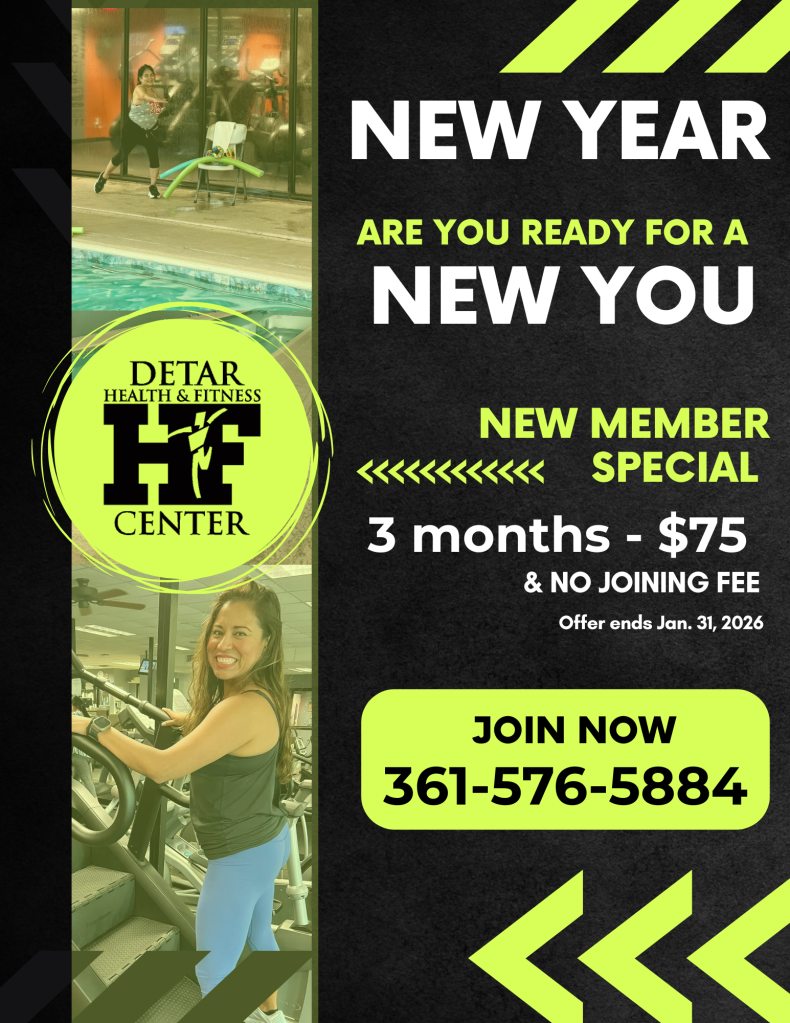 As the New Year approaches, DeTar Health & Fitness Center is inviting the community to start 2026 on a healthy note with a limited-time New Member Special designed to make fitness more accessible than ever. Now through January 31, 2026, new members can join DeTar Health & Fitness Center for $75 for three months with no joining fee. DeTar Health & Fitness Center is located at 4204 N. Laurent St. in Victoria.
